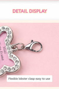 The sparkling crystal-style border adds a decorative touch, making it both a practical ID tag and a cute pet accessory.