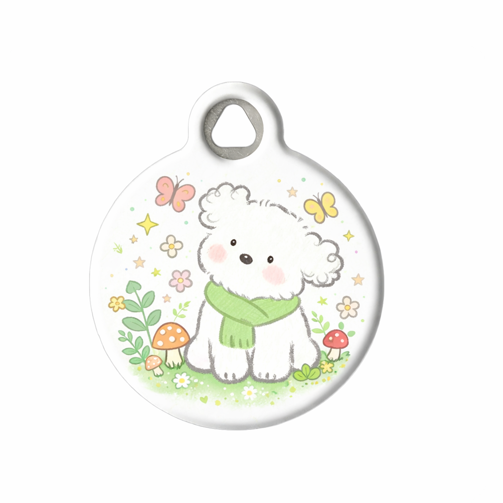 A sweet, nature-inspired pet ID tag featuring an original animated-style puppy surrounded by soft florals and woodland details. Designed for everyday wear, lightweight, durable, and perfect for pets who love gentle, cozy aesthetics.