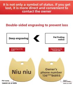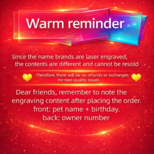 | The metal ID tag supports double-sided engraving. You may engrave your pet’s name, phone number, or other text. Chinese peace charms are decorative only and cannot be customized. |