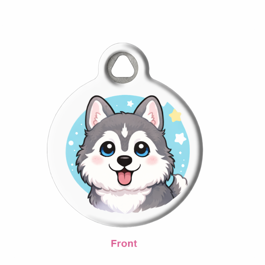 This adorable Siberian Husky-themed pet ID tag features a playful cartoon Husky with fluffy fur and bright blue eyes, perfect for any dog lover. The tag is available in two sizes—Small (7/8 inches, 22 cm diameter) and Large (1.25 inches, 3.18 cm diameter)—to fit pets of various sizes. Its lightweight and durable design ensure comfort for your pet while showcasing a personalized touch.